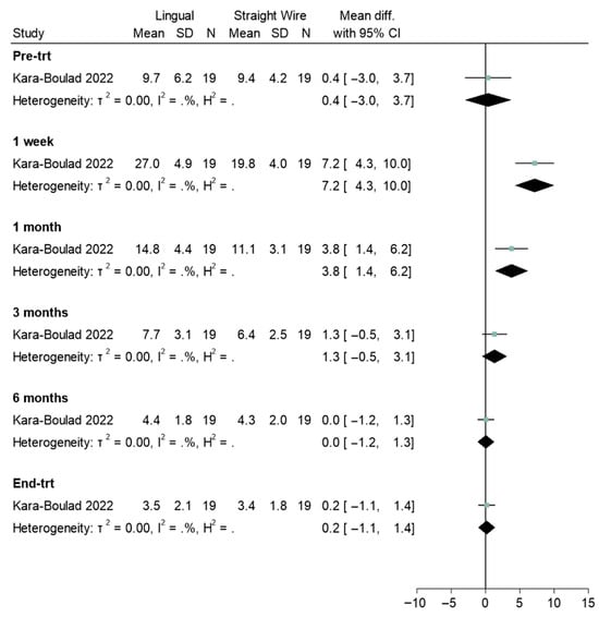 Four studies reported pre- and post-treatment experiences [31,32,36,39]. There was no difference pre-treatment when comparing aligners and labial appliances (Std. mean difference = 0.0, 95% CI: −1.5, 1.5; Figure 4). However, at all other timepoints a significant difference was found, with aligners scoring significantly lower than labial appliances (Figure 4). Lingual and straight wire appliances were also compared (Figure 5). There was no difference between appliances pre-treatment (Std. mean difference = 0.4, 95% CI: −3.0, 3.7). Statistically significant differences were observed at 1-week (Std. mean difference = 7.2, 95% CI: 4.3, 10.0) and 1-month (Std. mean difference = 3.8, 95% CI: 1.4, 6.1). Where a difference was observed, OHRQoL scores were significantly higher for the lingual appliance. Where heterogeneity could be assessed, there was relatively little heterogeneity in terms of sizes of group differences.