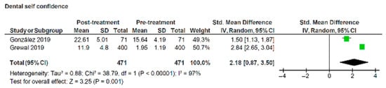 Two studies reported changes in OHRQoL using the PIDA [31,32]. The standardised mean difference for dental self-confidence tested across two publications indicated a significant increase between pre- and post-treatment scores of 2.18 (95% CI:0.87, 3.5) (z = 3.25, p = 0.001) (Figure 7). However, the heterogeneity was high between the studies (I2 = 97%), suggesting a greater degree of caution in interpreting the findings from these studies.