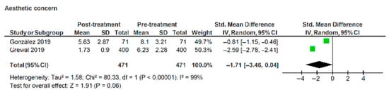 A reduction in aesthetic concern was not significant when the data were pooled (Figure 8), with scores of −1.71 (95% CI: −3.46, 0.04) (z = 1.91, p = 0.06). Heterogeneity across the studies was very high (I2 = 99%), again suggesting a greater degree of caution in interpreting the findings from these studies.