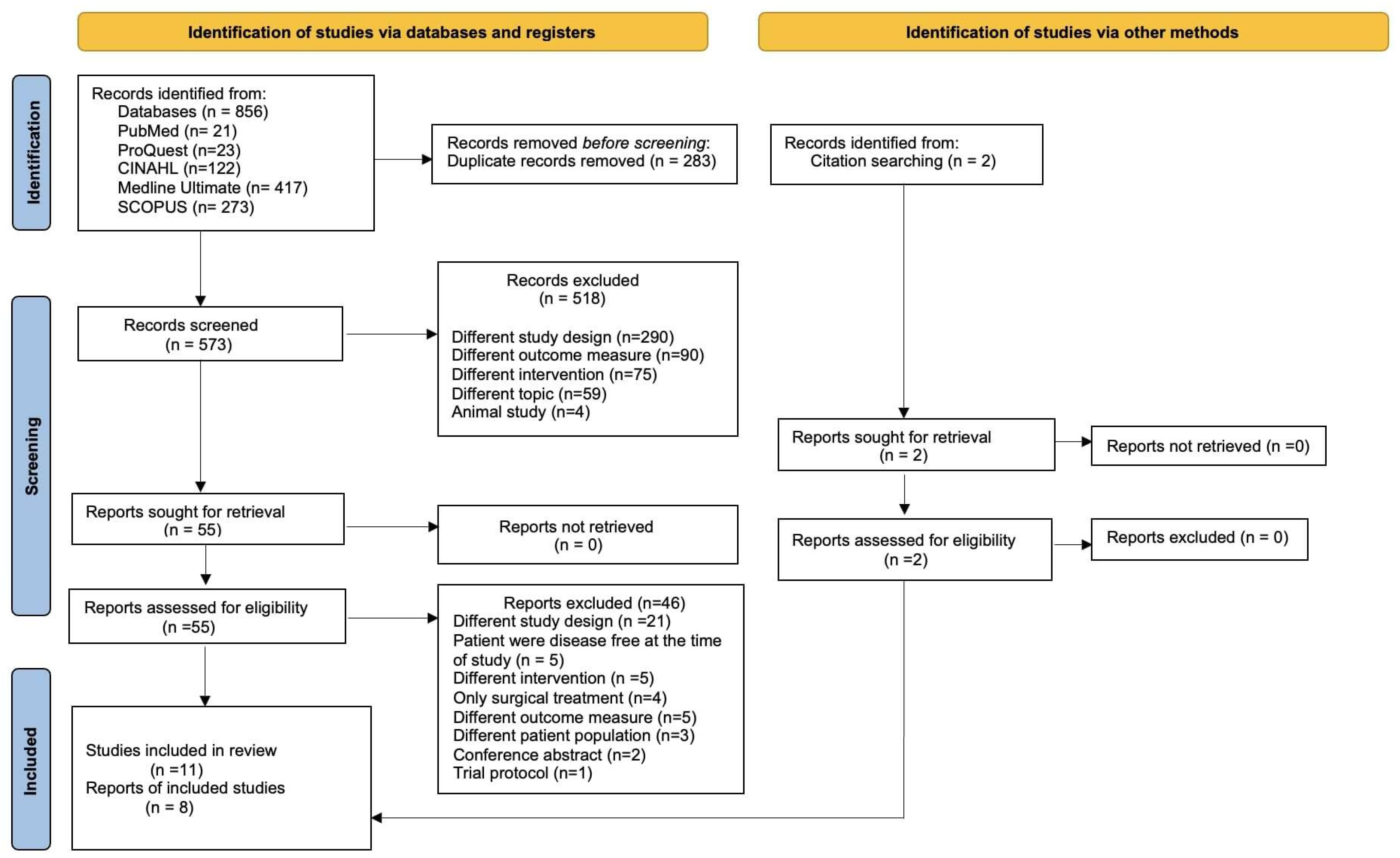 | Z. Zhou et al./2023 [32] China | 116 (ITT) IG: 61 CG: 55 95 (PP) IG: 48 CG: 47 | HNC/Esophageal cancer | IMRT | IG: HCF nutritional management model including weekly follow-up, community doctor support, and an individualized nutrition plan based on PG-SGA CG: Conventional hospital-based nutrition management only | Weekly evaluations for 3 months after EoRT | PG-SGA [33] and NRS2002 [34] score ECOG performance score Weight loss Serum albumin, prealbumin, and hemoglobin Treatment-related toxicity | PG-SGA [33] and NRS2002 [34] scoring system ECOG performance scale Weighing scale Blood tests RTOG grading for radiation toxicity | HCF group showed significantly better PG-SGA (p < 0.001), NRS2002 (p < 0.001), ECOG (p = 0.006), and less weight loss (p = 0.024). Higher albumin (p = 0.001), prealbumin (p = 0.046), and hemoglobin (p = 0.013). Reduced severity of radiation mucositis (p = 0.018) and dermatitis (p = 0.028). |