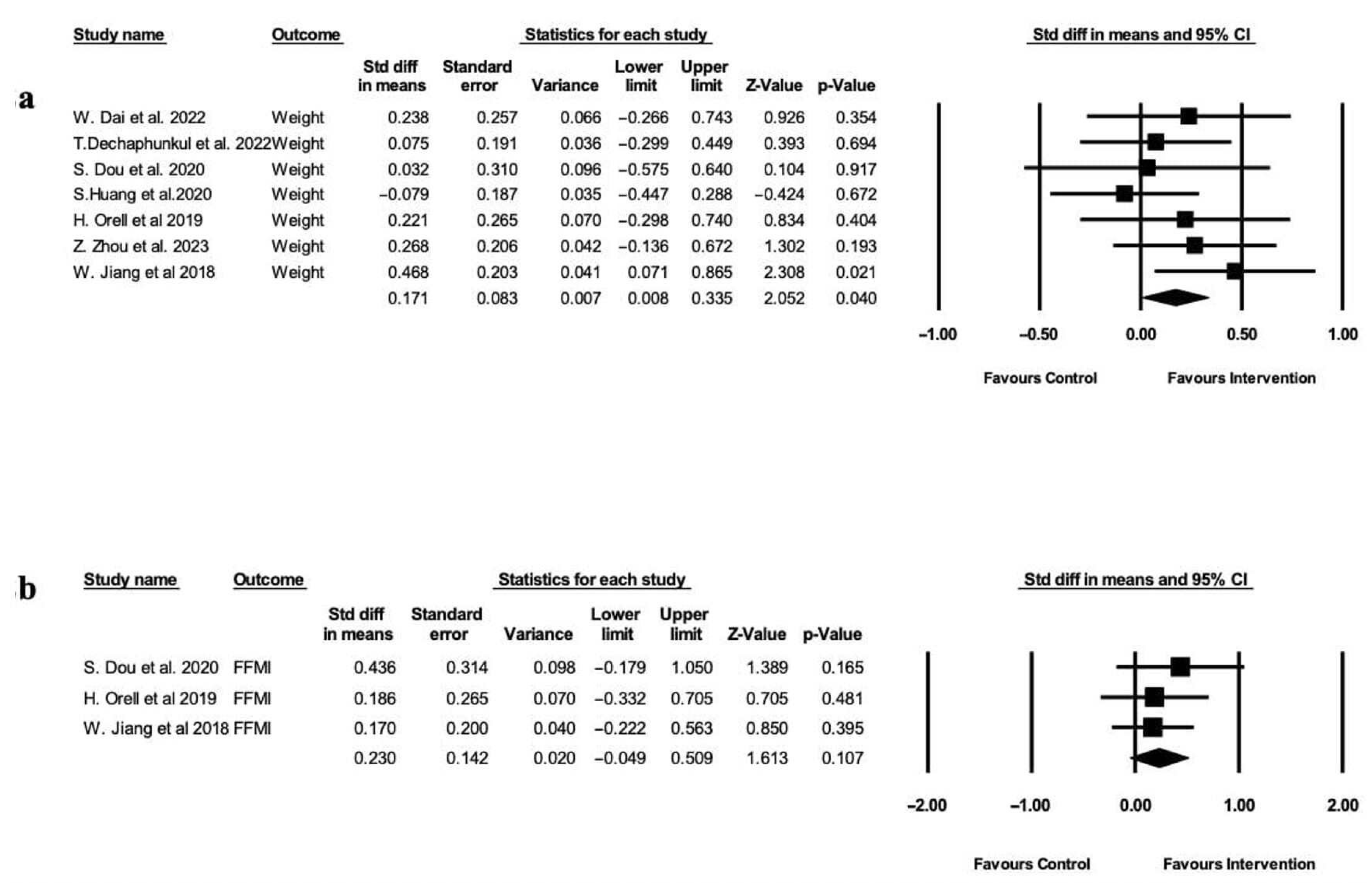 | FFMI | 3 | RCT | Serious | No serious | No serious | Serious (small sample size, CI crosses 0) | none | 217 | SMD = 0.230 (95% CI: –0.049 to 0.509), p = 0.107 | Low |