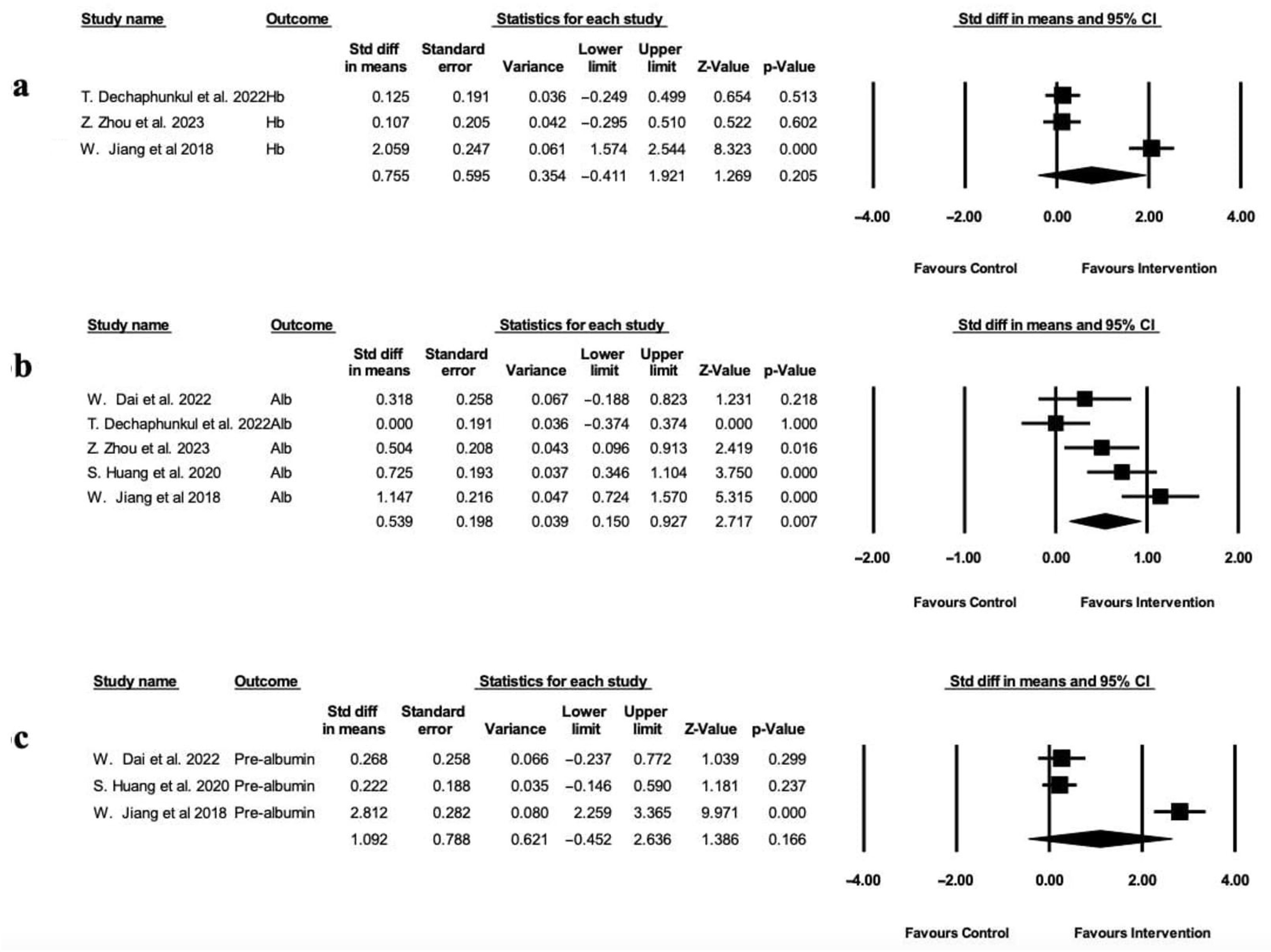 | Pre-albumin | 3 RCT | Serious | Serious (very high heterogeneity) | Not serious | Serious (small sample size, wide CI, effect driven by single study) | none | 314 | SMD = 1.092 (95% CI −0.452 to 2.636), p = 0.166 | Very low | |