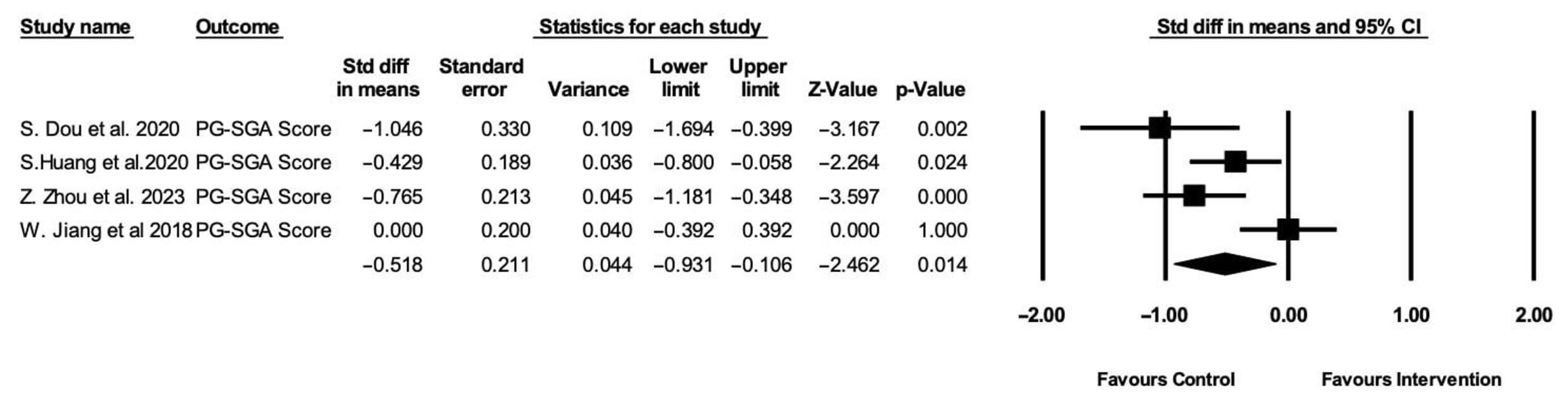 | PG-SGA | 4 | RCT | Serious | Serious | Not serious | Serious | none | 382 | SMD = –0.518 (95% CI: –0.931 to –0.106), p = 0.014 | Very low |
