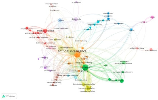 The largest and most interconnected clusters were centred around the keywords “artificial intelligence”, “machine learning”, and “deep learning”, reflecting the technological backbone of AI-based applications in dentistry. Other clusters were mainly related to “diagnosis,” “cone beam computed tomography (CBCT)”, and “image analysis,” indicating a strong focus on diagnostic imaging and automated detection systems. The other clusters highlighted terms such as “dentistry”, “dental caries”, “caries prediction”, and “caries prevention”, representing the application of AI tools to specific clinical domains. Finally, a small (but noteworthy) cluster included the keyword “decision making,” which appeared to be associated with terms related to diagnostic support and predictive modelling.