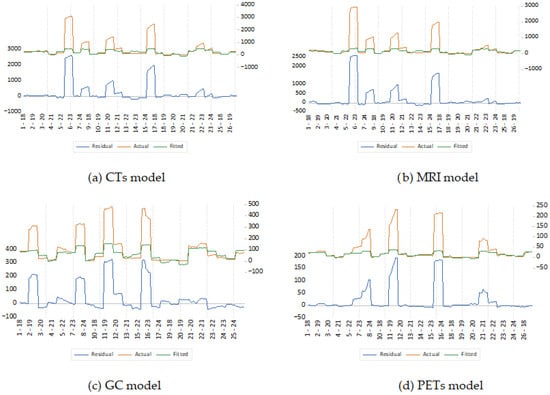 Figure 2 presents the graphical results of the General-to-Specific (GETS) algorithm applied to the four baseline models: (a) Computed Tomography (CTs), (b) Magnetic Resonance Imaging (MRI), (c) Gamma Cameras (GC), and (d) PET Scanners (PETs). Each subplot depicts the actual values (orange line), the fitted values obtained after GETS reduction (green line), and the residuals (blue line) for each country-year observation.
