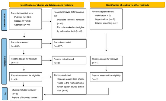 A PRISMA flow diagram is shown in Figure 1. After duplicates were removed, there were references retrieved via the initial database search. Their titles and abstracts were screened. Particular attention was paid to the key study terms of anteroposterior skeletal patterns, craniofacial morphology, and airway. The bibliographies of the included papers were reviewed. This resulted in one addition to the final list. The screening process resulted in the exclusion of 503 references, leaving nine full-text articles.