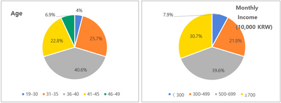 The demographic characteristics of the subjects were ascertained using data on gender, age, education levels, residential area, marital status, religion, economic activity, and household income. The participants were classified according to age, namely, 19–30, 31–35, 36–40, 41–45, and 46–49 years. They were divided into three categories based on educational levels: ≤high school, university graduate, ≥graduate school. In the case of the residential area, individuals in -dong were classified as urban, while those in -eup or -myeon were categorized as rural. The marital status of the participants was categorized as single, married, divorced/separated, or widowed. The participants were classified according to whether they were following a religion or not (yes or no, respectively) and based on their economic activity, they were classified as ‘employed’ or ‘unemployed’. They were also classified according to their monthly income into four categories: less than 3 million won, 3 to 4.99 million won, 5 to 6.99 million won, and 7 million won or more.