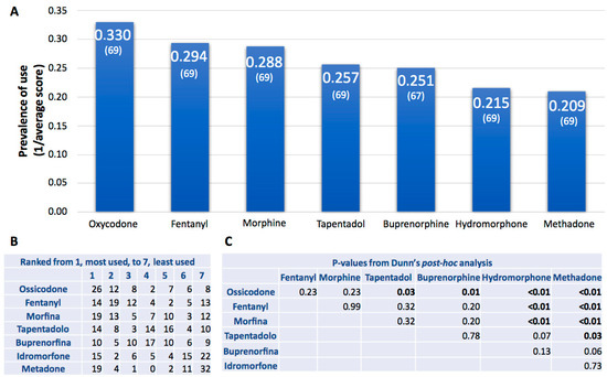 Prevalence of use of strong opioids in daily clinical practice. (A) Each drug was assigned a score from 1 (frequently used) to 7 (rarely used). The average score for each drug was calculated, and the inverse value was displayed as a histogram. The number of responses is shown in parentheses. (B) The table displays the number of respondents who assigned a score from 1 to 7 for each drug. (C) The statistical significance of the prevalence comparison between different treatments was determined using Dunn’s post-hoc analysis; the numbers in bold are statistically significant (p < 0.05).