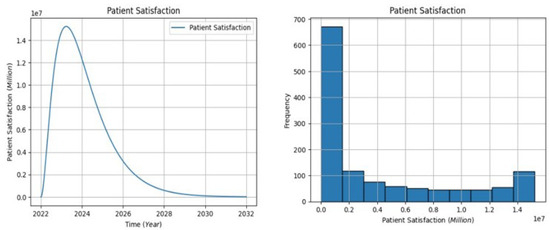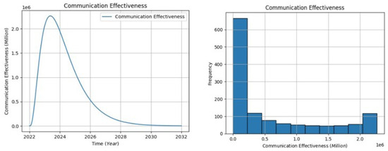 Figure 7 The projected communication effectiveness shows an initial increase, reaching a peak of approximately 2.4 million patient populations between 2022 and 2024, starting from a baseline of 0. However, a gradual decline ensues from around 2024 to 2032, indicating a diminishing effectiveness of communication between patients and healthcare providers. The distribution of communication effectiveness is portrayed on a graph with the horizontal axis representing the population impacted by communication, and the vertical axis denoting the frequency of these populations. The highest frequency falls between 0.0 and 0.23 million, while the lowest is between 0.23 and 2.5 million. The left-skewed distribution implies that higher populations experience more effective communication with healthcare providers. The declining trend could be attributed to various factors such as evolving technologies, shifting healthcare dynamics, or changing patient expectations. To address this decline, healthcare systems should consider continuous training for effective communication, the integration of advanced communication technologies, and regular assessments of patient–provider interactions. These interventions can contribute to sustaining and enhancing communication effectiveness over time.