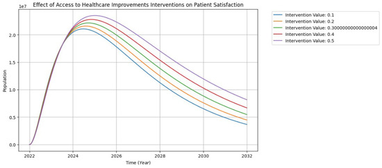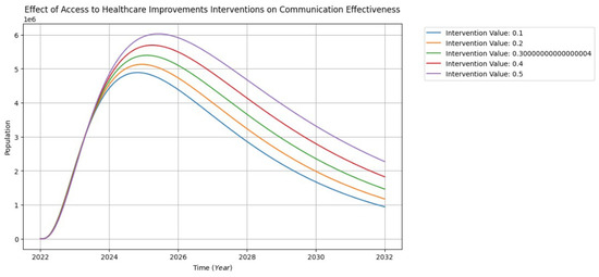 In Figure 12, commencing from 2022 on the graph, the intervention aimed at improving access to healthcare exhibits an initial 10% influence, resulting in a decrease in the patient health outcomes population from approximately 1.25 million in 2025 to about 0.75 million by 2032. During this period, the intervention effects appear latent. Subsequently, with incremental increases in interventions (20%, 30%, 40%, 50%) from 2028, there is a visible uptick in the population, peaking and gradually declining from 2030 to 2032.