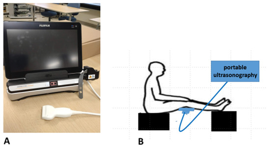 Figure 1. Measurements of the deep (popliteal) vein were performed using portable Doppler ultrasonography. (A) B-scan portable ultrasound device, Arietta Prologue (Fujifilm-Healthcare, Tokyo, Japan) with a linear probe (10 MHz). (B) The center of the probe was set vertically on the popliteal fossa.