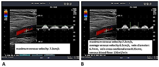 Figure 2. A Doppler examination of the popliteal vein was performed. (A) At least three waveforms were described. The horizontal bar was aligned with the top of the second tall wave to measure maximum venous velocity (cm/s). (B) The vertical bar was aligned with both ends of the second tall wave to measure average venous velocity (cm/s). The popliteal vein diameter (mm) and cross-sectional area (cm2) were measured to calculate the venous blood flow (mL/min).