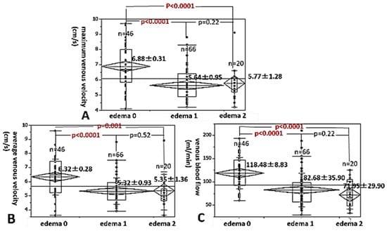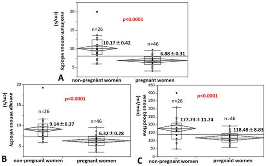 Figure 4. We investigated the level changes in the maximum (A) and average (B) venous velocities and the venous blood flow (C) in pregnant women at 36 gestational weeks, with and without leg edema.