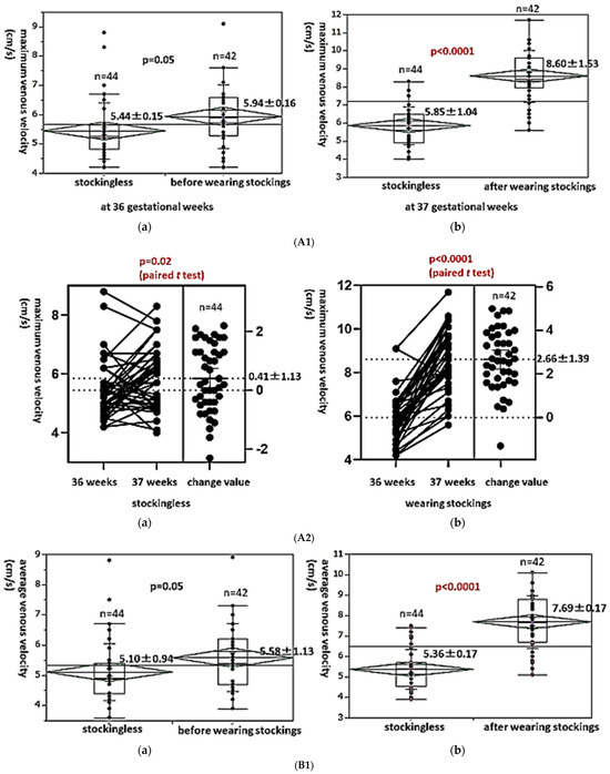 Similarly, there was no significant difference in the average venous velocity at 36 gestational weeks between the two groups (stockingless group vs. before wearing stockings group) (5.10 ± 0.94 cm/s vs. 5.58 ± 1.13 cm/s, p = 0.05, Figure 5(B1a)). However, the average venous velocity was also significantly higher in the edematous legs of pregnant women after wearing stockings than in pregnant women without stockings (7.69 ± 0.17 cm/s vs. 5.36 ± 0.17 cm/s, 43.5% increase, p < 0.0001, Figure 5(B1b)). The level changes in average venous velocity in pregnant women with elastic stockings were significantly higher than those in pregnant women without stockings (2.11 ± 1.45 cm/s vs. 0.25 ± 1.04 cm/s, paired t-test: p < 0.0001 vs. p = 0.10, Figure 5(B2a,B2b)).