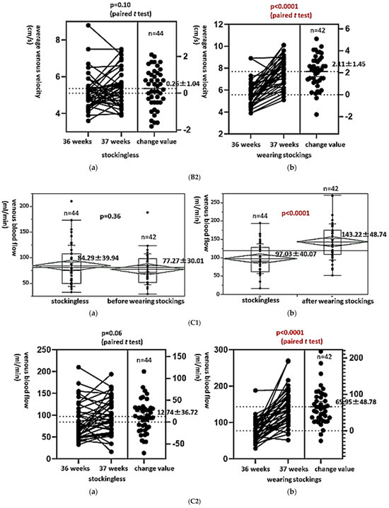 The same trend was observed for the venous blood flow. There was no significant difference in the venous blood flow at 36 gestational weeks between the two groups (stockingless group vs. before wearing stockings group) (84.29 ± 39.94 mL/min vs. 77.27 ± 30.01 mL/min, p = 0.36, Figure 5(C1a)). However, the venous blood flow was also significantly higher in the edematous legs of pregnant women after wearing stockings than in pregnant women without stockings (143.22 ± 48.74 mL/min vs. 97.03 ± 40.07 mL/min, 47.6% increase, p < 0.0001, Figure 5(C1b)). The level changes in the venous blood flow in pregnant women with elastic stockings were significantly higher than those in pregnant women without stockings (65.95 ± 48.78 mL/min vs. 12.74 ± 36.72 mL/min, paired t-test: p < 0.0001 vs. p = 0.06, Figure 5(C2a,C2b)).