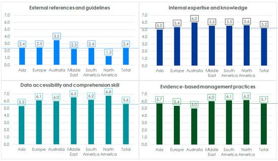 Hospitals in North and South America, as well as the Middle East, demonstrated easier access to data and a stronger capacity to understand the quality and implications of the data. These factors contributed to a higher adoption of evidence-based management (EBM) principles in these regions. Conversely, hospitals in Europe, despite having better access to data, scored lower in data-based practices. Interestingly, hospitals in Asia showed stronger adherence to EBM principles compared to Australia and Europe, even though their access to data was comparatively limited.