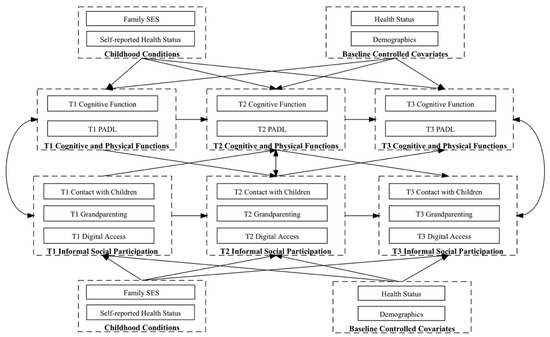 The data analysis was conducted using Stata 17.0. The structural equation modeling (SEM) method was employed. SEM is a comprehensive statistical technique that allows researchers to simultaneously examine complex relationships among observed and latent variables. It integrates multiple regression and factor analyses, enabling the assessment of direct and indirect effects within a hypothesized model [69]. Thus, one structural equation model was estimated, as informal social participation (i.e., low contact with children, grandparenting, and digital access) and cognitive and physical functions (i.e., cognitive function and PADL) were associated in a cross-lagged manner [70]. Following [71], the cross-lagged associations between indicators of informal social participation and cognitive and physical functions of three waves or time points (i.e., T1 in 2016, T2 in 2018, and T3 in 2020) were examined. Specifically, the reciprocal associations over time between low contact with children, grandparenting, and digital access, as well as cognitive function and PADL were tested by regressing each variable on the prior years’ variables reciprocally. The influences of childhood conditions were treated as predictors for indicators of informal social participation and cognitive and physical functions of three time points. Autoregression effects were estimated by regressing each dependent variable on its prior year’s variable. To align with the standards for cross-lagged structural models and accurately interpret the temporal dynamics between variables without the confounding influence of time-related changes, we followed the common practice of assuming that the cross-lagged paths were stationary [72]; thus, these coefficients were set as equal across time. All the associations were adjusted for baseline covariates (i.e., T1), including health status and demographics. The conceptual model is shown in Figure 1.