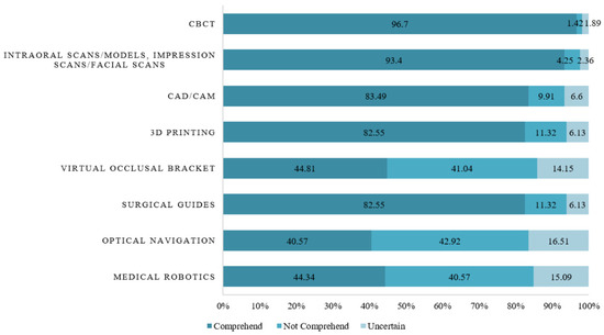 Dentists had a good understanding of the application of digital dental technology in oral implantology (197, 92.92%), prosthodontics (194, 91.51%), the diagnosis of dental disease (185, 87.26%), orthodontics (177, 83.49%), endodontics (156, 73.56%), and maxillofacial surgery (138, 65.09%), while a mere of 95 (44.81%) participants were aware of the application of digital technology in periodontics (Appendix A Table A1). CBCT was the most well understood digital dental technology among the dentists (205, 96.70%), followed by intraoral scanning/models and digital impression scanning/facial scanning (198, 93.40%), CAD/CAM (177, 83.49%), 3D printing (175, 82.55%), and surgical guides (175, 82.55%). Less than half of the dentists were aware of the application of virtual occlusal brackets (95, 44.81%), medical robotics (94, 44.34%), and optical navigation (86, 40.57%) (Figure 1). A total of 207 (97.64%) dentists believed that “the data of digital technologies is easy to share/store/transfer”, while only 144 (67.92%) dentists thought “digitally designed and produced restorations give better outcomes than with traditional methods” (Appendix A Table A1). It is evident that dentists in China had overall sufficient knowledge, but there were still gaps in the application of digital technology in periodontics, as well as the application of virtual occlusal brackets, medical robotics, and optical navigation.