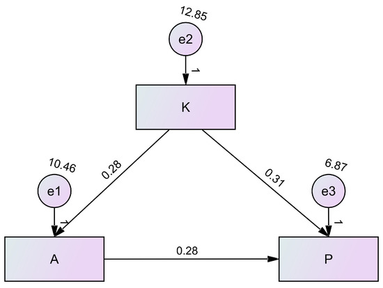 Pearson correlation analysis revealed that the knowledge scores of participants were positively correlated with their attitude scores (r = 0.300, p < 0.001) and their practice scores (r = 0.450, p < 0.001), and their attitude scores were also positively correlated with their practice scores (r = 0.414, p < 0.001) (Table 2). The SEM showed that knowledge had a direct effect on attitude (β = 0.283, p < 0.001), and attitude had a direct effect on practice (β = 0.280, p < 0.001), demonstrating that knowledge had an indirect effect on practice and supporting the first (H1) and third (H3) hypotheses. Knowledge also had a direct effect on practice (β = 0.310, p < 0.001) (Table 3 and Figure 3), supporting the second hypothesis (H2).
