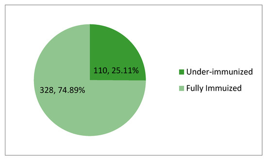 The proportion of participants who have received some, but not all vaccine doses was calculated by (number of under-immunized participants/total number of participants) × 100%; (110/438) × 100% = 25.11% (Figure 1).