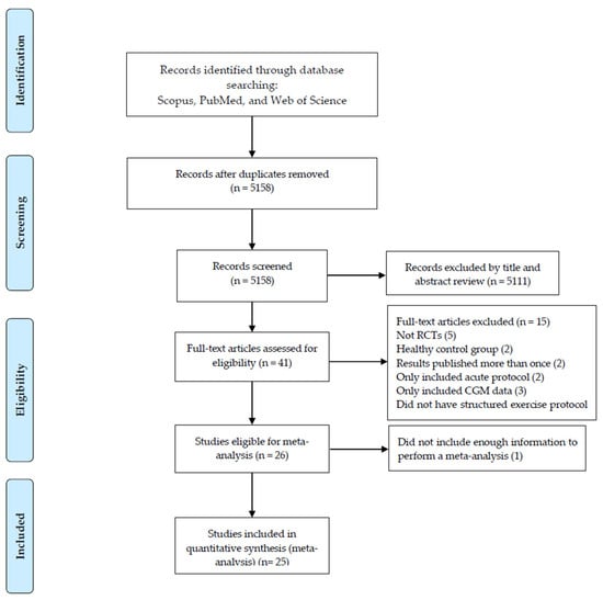 The three main electronic database searches yielded 5532 records and 5158 records remained after removing duplicates. Based on the title and abstract screening, 5117 records were excluded, and, subsequently, 41 articles were eligible for the full-text screening. Finally, 16 articles were excluded for reasons presented in Figure 1, and 25 articles met all inclusion criteria and were included in the meta-analysis. All included studies were randomized control trials with parallel or crossover designs.
