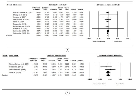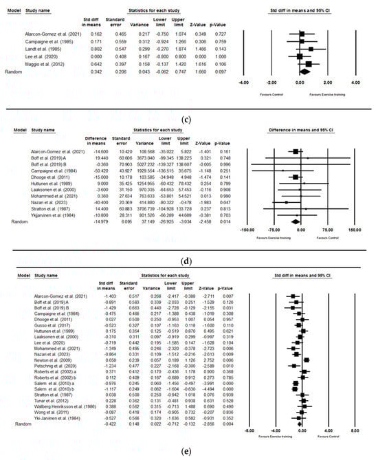 The following information and data were extracted from the included articles: first author name and publication year, sample size, study design, participant characteristics including age, sex, and BMI, intervention characteristics including exercise mode, exercise intervention duration and protocol, and outcome variables. In addition, to perform the meta-analysis, mean changes (post–pre values) and their standard deviations (SD) were extracted or calculated from the mean and SD values at pre- and post-intervention using a formula recommended in the Cochrane Handbook with conservative values of 0.5 for correlations. When data were reported as medians and IQRs, or standard errors and 95% confidence intervals (CIs), the required data were calculated using validated methods [,,]. In addition, when data were only reported in figures, the required data were extracted using the Getdata Graph Digitizer software (2.24). If studies had more than one exercise intervention arm, they were included as separate arms and the sample size for the control group was halved. In order to enhance the clinical interpretation of the results, the data for lipid profiles and fasting glucose were expressed as mg/dL, and, when required, mmol/L values were converted to mg/dL using relevant formulas []. In addition, for HbA1c, units reported in mmol/mol were converted to percentages using the relevant formula []. The data were extracted by two independent authors (S.F. and F.S.) and any disagreements were resolved through discussion with another author (M.K.).