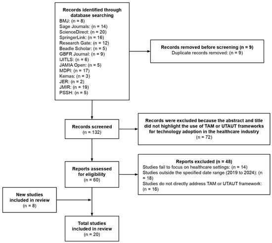 Following the inclusion of these records, a total of 9 duplicate records were eliminated through screening, leaving 132 records for the second review phase. Out of these records, 72 entries were removed because the use of TAM or UTAUT frameworks to investigate medical technology adoption was not demonstrated in their titles or abstracts. Following the evaluation of the remaining 60 records for eligibility, 48 records were disqualified for a variety of reasons: 18 of them were not published between 2019 and 2024, 16 of them did not specifically address the TAM or UTAUT framework, and 14 of them did not deal with the healthcare industry.