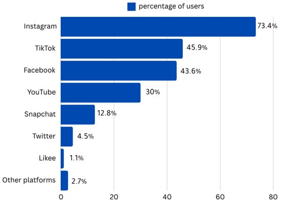 The mean SVA score was 13.15 (±3.61), ranging from 4 to 20 (Figure 1). Of the total participants, 50% had SVA scores above 13, while 25% had SVA scores above 16. The platforms that were most frequently used for short-form video views were Instagram (73.4%), TikTok (45.9%), and Facebook (43.6%). Figure 2 displays all other platforms. Almost 18.8% of the participants used their smartphones for more than 8 hours each day. When asked about their perception of the TikTok ban imposed by the Jordanian government in December 2022, 15% of the participants expressed feeling annoyed, with an additional (6.5%) reporting extreme annoyance.