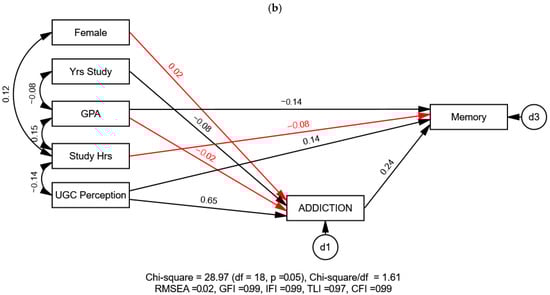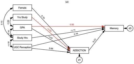 Attention did not moderate the relationship between short-form video addiction and memory. All the path coefficients were standardized. The black path coefficients were significant at the 0.05 level, and the red path coefficients were nonsignificant. (a) High attention (n = 536); (b) low attention (n = 493).