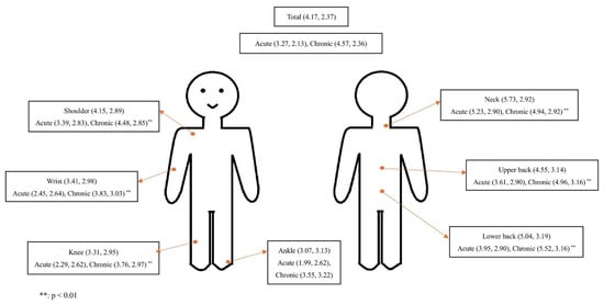 The total mean pain score of all the pain participants was 4.17 (SD = 2.37), with acute pain registering a mean score of 3.49 (SD = 2.19) and chronic pain registering a mean score of 4.83 (SD = 2.53). Notably, neck, lower back, and upper back emerged as the most common sites of pain, with mean scores of 5.73 (SD = 2.92), 5.04 (SD = 3.19), and 4.55 (SD = 3.14), respectively. In the comparison of mean pain intensity between acute and chronic pain, significantly higher pain intensity was found in the acute pain group with neck pain, whereas other body sites showed significantly higher intensity in the chronic pain group (p-value: <0.001) (Figure 1).