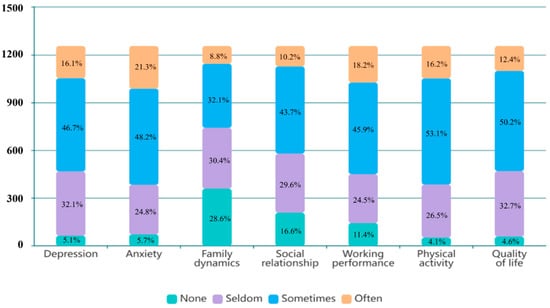 Participants reported that their pain affected various aspects of psychosocial functions, including mood, family dynamics, and social relationships. Over 90% indicated experiencing distressed moods seldom to often, with sometimes being the most frequently reported frequency. Additionally, 71.4% and 83.4% of participants reported that their pain had varying degrees of impact on their family and social aspects (Figure 2). Table 2 presents functional limitations: 44.1% of participants reported that their family members were unable to understand their pain suffering, and 37.7% reported an inability to do housework. More than half of the participants expressed fear of experiencing sudden pain while meeting others, and 47.7% reported unwillingness to share their pain experiences.