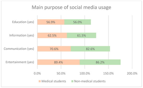 In the present study, the main purpose of SM usage was entertainment (> 80%), followed by communication (> 75%) and information (> 60%). These percentages were higher compared to another study by Alsaud et al. (2019) which reported 58%, 69%, and 75%, respectively [28]. The observed variation may be attributed to the fact that the later study was conducted only among female students, suggesting that females may be more interested in searching for information rather than using SM solely for entertainment or communication.