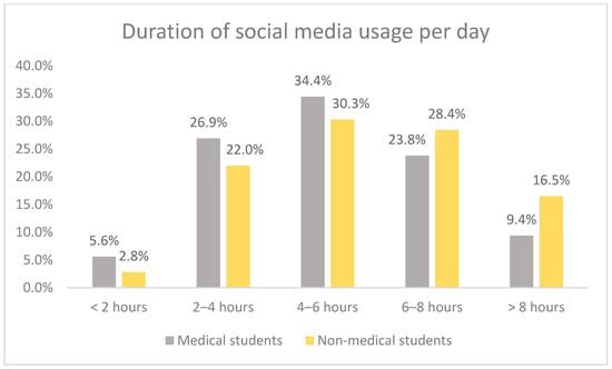 The duration of SM usage plays a major role in a person’s behavioral, academic, and social development, particularly among the student population. In the present study, 32% of participants reported using SM for 4 to 6 h per day. This is higher than the global average of 2 h and 27 min per day [31]. Our findings align with a previous study by Alshanqiti et al., where 49.5% of the participants used SM for 3 to 5 h per day [32]. Additionally, two other studies reported 1 to 3 h of SM usage among medical students [33,34]. Interestingly, studies from Turkey and Indonesia revealed that SM usage increased after the COVID-19 pandemic [35,36]. This may be attributed to the shift to online courses and classes in the post-pandemic period, resulting in higher usage of SM and the internet.