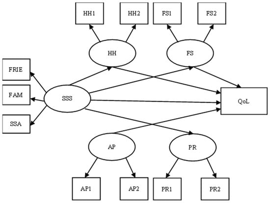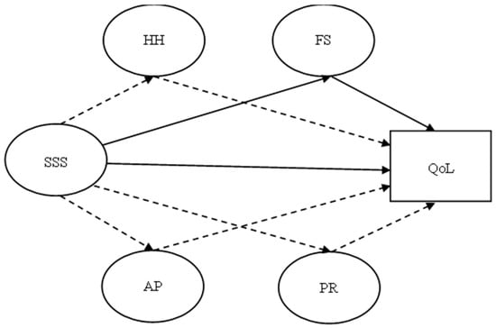 The expected mediation model for the relationships between satisfaction with social support (SSS), coping strategies (i.e., fighting spirit—FS, positive redefinition—PR, helplessness–hopelessness—HH, and anxious preoccupation—AP) and quality of life (QoL). Note: Positive paths in continuous lines and negative paths in dashed lines.