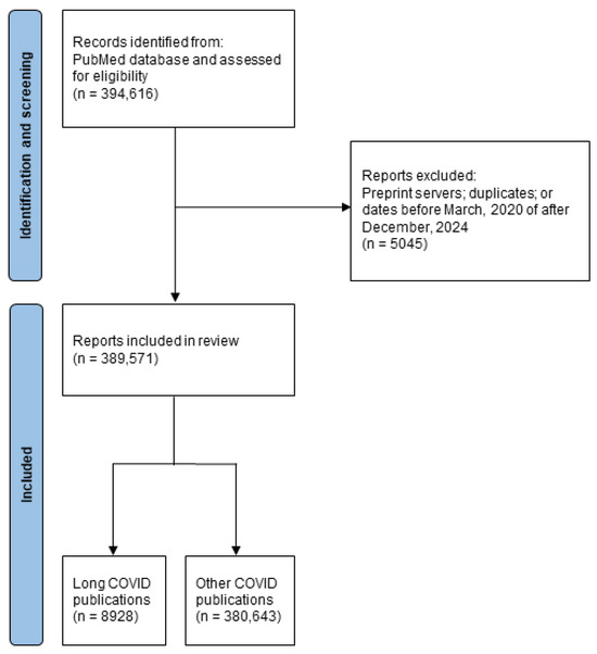 The data from a total of 394,616 COVID-19 publications were extracted from PubMed. After the exclusion criteria were applied (duplicate publications, publications from preprint servers, publications published before 1 March 2020 or after 31 December 2024, or with any missing date data), 389,571 COVID-19 publications were available for analysis (Figure 1).