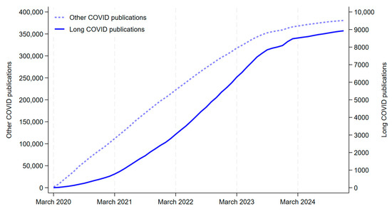 Figure 2 shows the cumulative number of long COVID publications and other COVID publications from March 2020 (the month when the World Health Organization declared the COVID-19 pandemic, 11 March 2020) to December 2024. The cumulative total of long COVID publications was 8928 (2.3% of all COVID-19 publications).