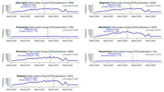 Figure 3. Time trends of long COVID publications according to research topics, 2020–2024. The red dashed vertical line indicates the month when the long COVID publication maximum peak occurred. p for trend values was calculated using the Mann–Kendall test (from onset to time of maximum peak).