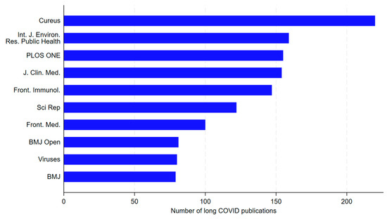 Figure 4. Top 10 journals with the highest frequency of long COVID publications, 2020–2024. BMJ: The BMJ; Front. Immunol.: Frontiers in Immunology; Front. Med.: Frontiers in Medicine; Int. J. Environ. Res. Public Health: International Journal of Environmental Research and Public Health; J. Clin. Med.: Journal of Clinical Medicine; Sci Rep: Scientific Reports.