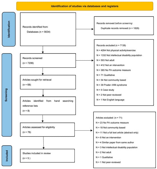 - Pitchford, E.A.; Dixon-Ibarra, A.; Hauck, J.L. Physical activity research in intellectual disability: A scoping review using the behavioral epidemiological framework. Am. J. Intellect. Dev. Disabil. 2018, 123, 140–163. [Google Scholar] [CrossRef] [PubMed]