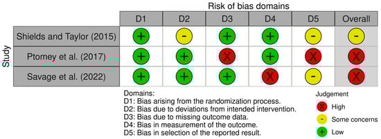 The Risk of bias VISualisation (Robvis) tool was used to assess the quality of the included studies across the risk of bias domains included in each tool. The Robvis tool contained the risk of bias judgements for each domain of the ROB2 (Figure 2) and ROB2 CRT tools (Figure 3). Summary graphs produced by the Robvis tool are available as Supplementary Materials.