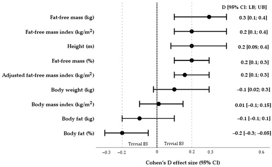The measure of Cohen’s D reports the effect size of mean differences in the core elements of body composition after comparing them to participants with different symptomatology of somatization (15 ≤ PHQ-15 ≤ 30 vs. PHQ-15 score ≤ 14). ES—effect size; 95% CI—95% confidence interval; LB—lower bound; UB—upper bound.