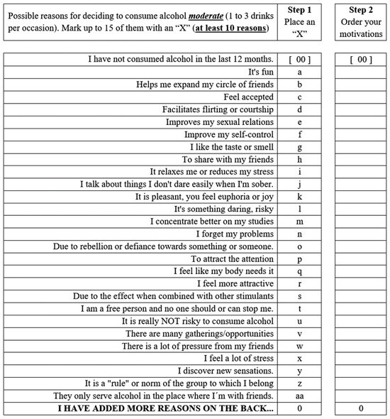 Once the objective of the study was explained, and students were invited to participate voluntarily, each student signed an informed consent form following local and international ethical guidelines. Then, the questionnaires were administered individually following the procedures proposed by [28]. Furthermore, the team that administered the questionnaires underwent prior training to ensure neutrality in the questions and to minimize bias in the students’ responses. Informed consent was obtained, highlighting the importance of confidentiality and anonymity. The items were evaluated by a group of professional experts to ensure that the questions did not contain elements that would lead to suggestive responses and to mitigate social desirability. Each student was given a list of 27 motivations for consuming alcohol and asked to select all the reasons or motivations they had used to drink alcohol, leaving them open to the possibility of adding others (Figure 1). They were asked to order each of the indicated motivations by assigning the number one to the one that best defined the most potent reason, followed by number two, until they had finished all the motivations they had chosen or added. When participants reported that they had drunk both moderately and severely, they were asked to fill out both formats.