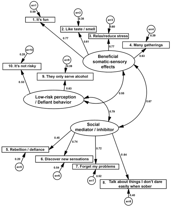 By eliminating duplicate items in two or more factors, ten final items remained in the moderate consumption subscale (Table 3) and thirteen in the severe consumption subscale (Table 3), with a final total alpha of 0.886 and 0.884, respectively, explaining 57.5% and 70.5% of their variances. In the final subscales of the questionnaire for moderate consumption, items were confirmed for the three factors corresponding to the three motivational dimensions defined initially (Table 3): (i) Low-risk perception or defiant behavior (Factor 3 with two items), (ii) Social mediator or disinhibitory (Factor 2 with four items), and (iii) Beneficial somatic-sensory effects of alcohol (Factor 1 with four items).