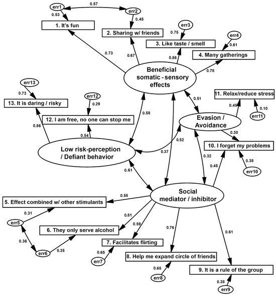Confirmatory model of four factors of motivations for severe alcohol consumption in Mexican university students (n = 82). Chi-squared = 80.61, 56 df, p ≤ 0.001; CMIN/df = 1.44; RMR = 0.091; GFI = 0.877; CFI = 0.949; RMSEA = 0.074 (0.032–0.108).