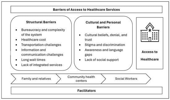 The analysis resulted in three major themes: (1) structural barriers, (2) cultural and personal barriers, and (3) facilitators of access to healthcare services. As presented below, several sub-themes were identified under each major theme across the ten studies.