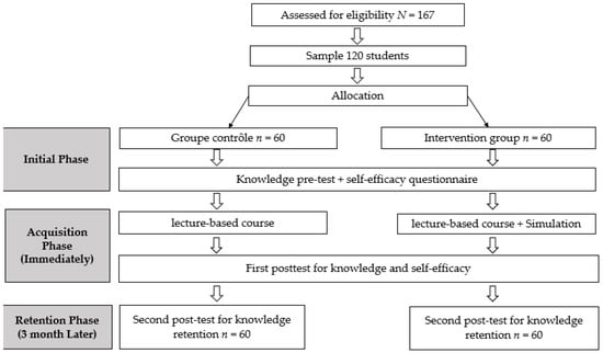 A quasi-experimental design was used in this study, with a pre-test and post-test to assess the effect of simulation on knowledge acquisition, retention, and self-efficacy among nursing students. In order to minimize selection bias and ensure initial comparability between the two groups, participants were randomly selected and then randomly assigned to either the experimental group or the control group.