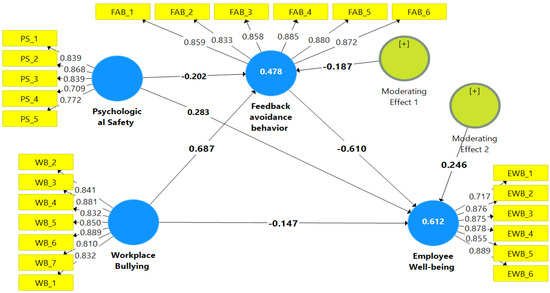 The questionnaire consisted of two main sections: the first focused on collecting demographic information about the respondents, while the second included items related to the four constructs outlined in the hypothesized model. All variables’ measures were borrowed from prior research and evaluated on a 5-point Likert scale. The WB was gauged using seven items (α = 0.91) from Einarsen et al. [58]. The sample items include: “Persistent criticism of your work and effort” and “Someone reminding you repeatedly about your errors or mistakes”. The EWB was assessed utilizing six items (α = 0.87) from Zheng et al. [59]. The measure includes items such as: “I am satisfied with my work responsibilities” and “In general, I feel fairly satisfied with my present job”. Five items (α = 0.72) for measuring PS were borrowed from Liang et al. [60]. Sample items include the following: “In my work unit, I can express my true feelings regarding my job”, and “In my work unit, I can freely express my thoughts”. Finally, the six-item scale (α = 0.81) from Moss [39] was used to gauge FAB. The sample items include: “I tried to schedule outside appointments to avoid my supervisor” and “I went the other way when I saw my supervisor coming”. Sixteen academics and practitioners evaluated the questionnaire items in terms of clarity, terminology accuracy, and employees’ ability to understand the measurement items for the study constructs. Based on this evaluation, the content remained unchanged throughout the process.
