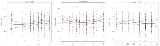 In Figure 1, it can be observed that Factor 5, “Improvement options”, from the Font-Roja job satisfaction questionnaire is the only one that shows a statistically significant association with the total score of the professional quality of life questionnaire CVP-35, with a p-value of 0.016. Other factors, such as Factor 1, “Job satisfaction”, also approach statistical significance with a p-value of 0.063. When applying a reduced multivariate regression model, which includes the nonlinear relationship detected in Factor 5 and other factors with linear effects, significant associations are identified with Factors 1 and 9, with p-values of 0.046 and 0.008, respectively. In this model, Factor 1 has a proportional association and Factor 9 an inverse association with professional quality of life. The model that best explains the total CVP-35 score, according to the Akaike Information Criterion (AIC), includes Factors 1, 2, 5, 8, and 9. Although Factors 2 and 8 do not reach statistical significance due to their p-values (>0.05), their inclusion in the model remains relevant, with Factor 5 showing a predominant nonlinear relationship.