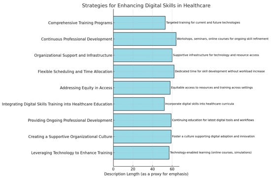 To promote the adoption of digital skills among health professionals, several key strategies can be implemented, as seen in Table 6 and Figure 2, which were identified via a literature review.