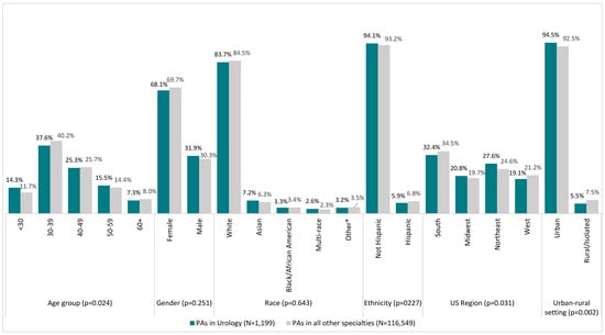 | PAs in Urology (N = 1199) | PAs in All Other Specialties (N = 116,549) | p-Value † | ||